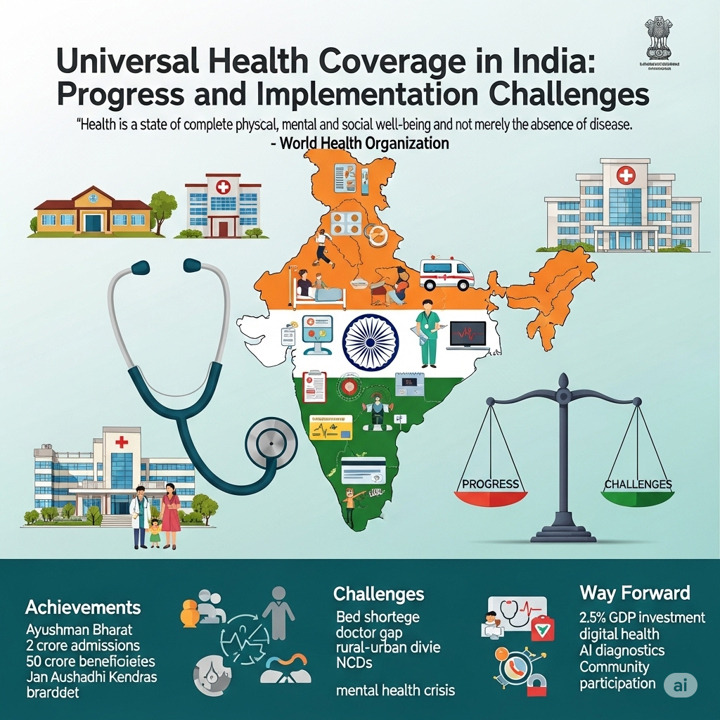 While India has made significant strides in UHC through Ayushman Bharat and digital health initiatives, achieving comprehensive coverage requires addressing infrastructure gaps, human resource shortages, and ensuring equitable access. Success demands sustained political commitment, increased health expenditure, and integrated approach combining preventive and curative care for truly inclusive healthcare system.